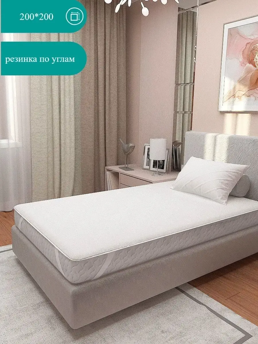 Наматрасник непромокаемый размер 200х200 водонепроницаемый на резинках по углам - надежная защита для матраса, для топпера ikea. Наматрасник непромокаемый 200 200 см изготовлен из махрового трикотажа 100% хлопок с мембранным покрытием мулитон аквастоп aquastop. Крепление к матрасу осуществляется за счет 4-х резинок по углам наматрасника. Наш намотрасник подходит на кровать в спальню, на диван, и для мягкой мебели. Чехол на матрас 200х200 обеспечит комфорт спальному месту и не даст простыне скользить. Непромокаемый чехол на матрас прекрасно защищает поверхность матраса от влаги и грязи. Наматрасник водонепроницаемый 200*200 выдерживает большое количество стирок и имеет длительный срок эксплуатации. Белый чехол в спальню отлично сочетается с белой мебелью в вашем доме, подходит для детской кровати в детскую комнату для мальчика и для девочки. Состав: материал верха 100% хлопок, материал низа - полеуриетановая мембрана (100% полиэстер) - мягкий и прочный материал, который не даст усадки при стирке. Гигроскопичен и гипоалергенный топер. Защита мебели от кошек. Для мам и малышей. Дополнительными плюсами является то, что он не требует глажения, антиаллергенен и приятен на ощупь. Советы по уходу: не рекомендуется отбеливать хлором, химчистка, стирать в стиральной машине только в щадящем режиме, при этом сушить и выжимать в машине наматрасник нельзя, оптимальная температура воды при стирке - 40 градусов.