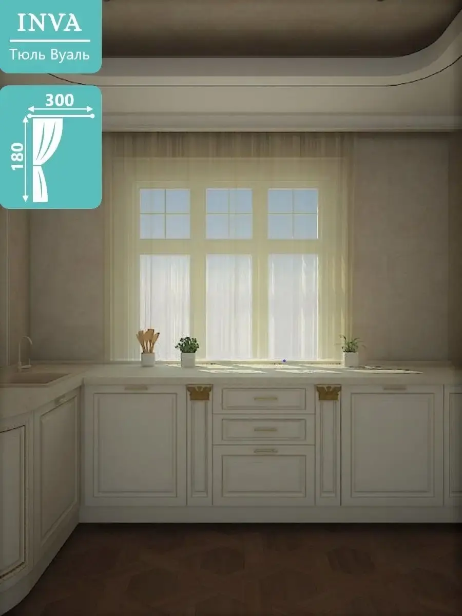 Вы хотите преобразить свой дом и создать красивый и уютный интерьер? Тогда наша короткая тюль - это то, что вам нужно! Тюль на кухню короткая из полупрозрачной вуали, высотой 180 см ширина 300 см. Эти шторы для кухни будут стильным декором для комнат в вашем доме. Высота шторы позволяет использовать ее в качестве гардин для гостиной, для спальни, для кухни и в детскую комнату. В комплекте гардина для штор имеет крепление к карнизу для крючков или штанги. Занавески на кухню короткие представлены в разных цветах и подойдут в дом, квартиру, для дачи и на балкон. Тюль подходит для потолочного карниза шириной до 300 сантиметров а так же для карниза со штангой с диаметром до 20 мм. Тюль имеет пришитую шторную белая лента шириной 6см, которая легко стягивается на четыре кордовые нити и создает аккуратные складки в форме "бабочки". Обязательно проверьте нити в шторной ленте, они должны быть надежно завязаны с одного края. Мягкая, легкая занавеска с элегантными складками, идеально вписывается в интерьер. Тюль хорошо пропускает свет, устойчива к воздействию прямых солнечных лучей. В составе ткани полиэфирное волокно, что делает изделие практичным и устойчивым к большому количеству стирок. Уход: стирка при 40 градусах, деликатный отжим, отбеливание запрещено.