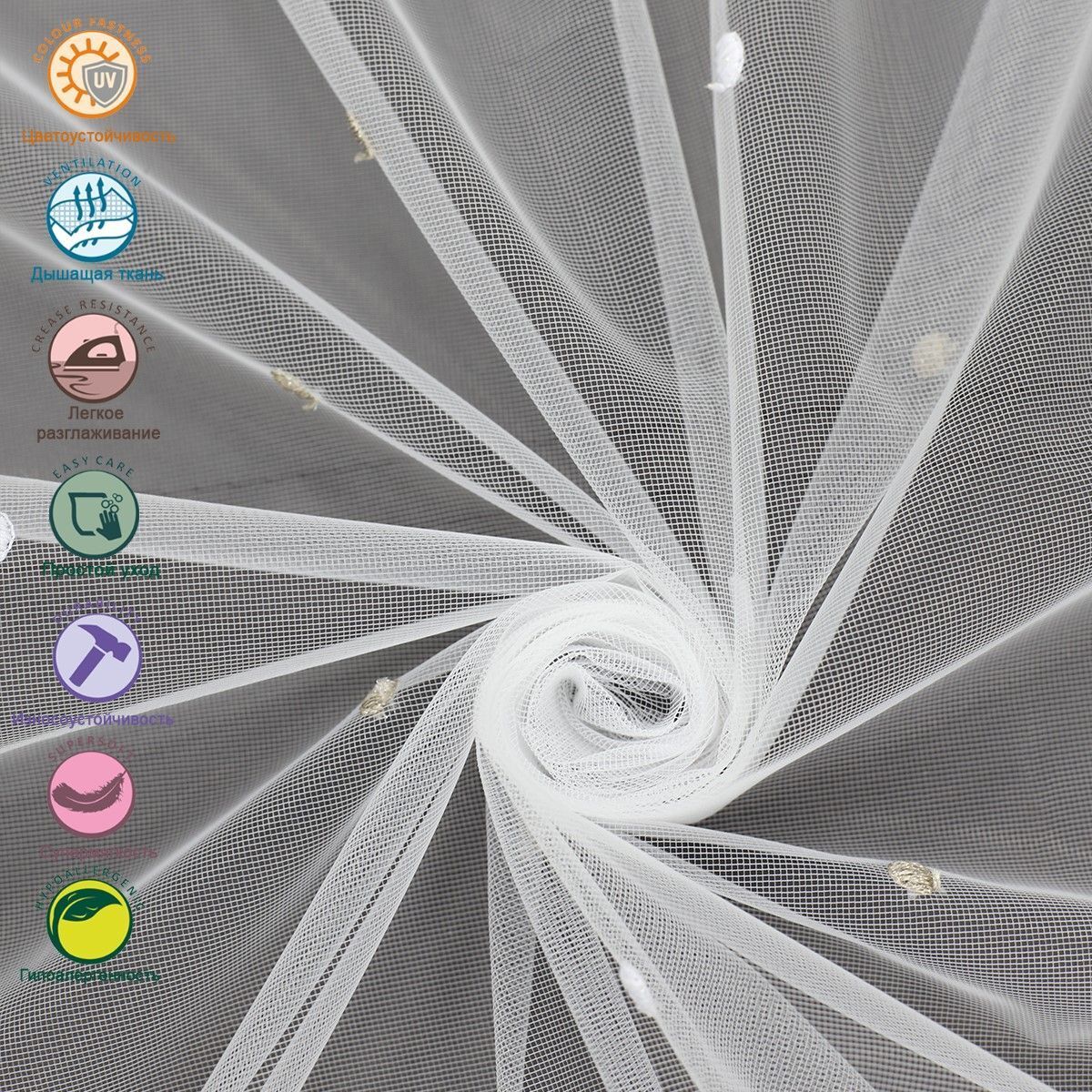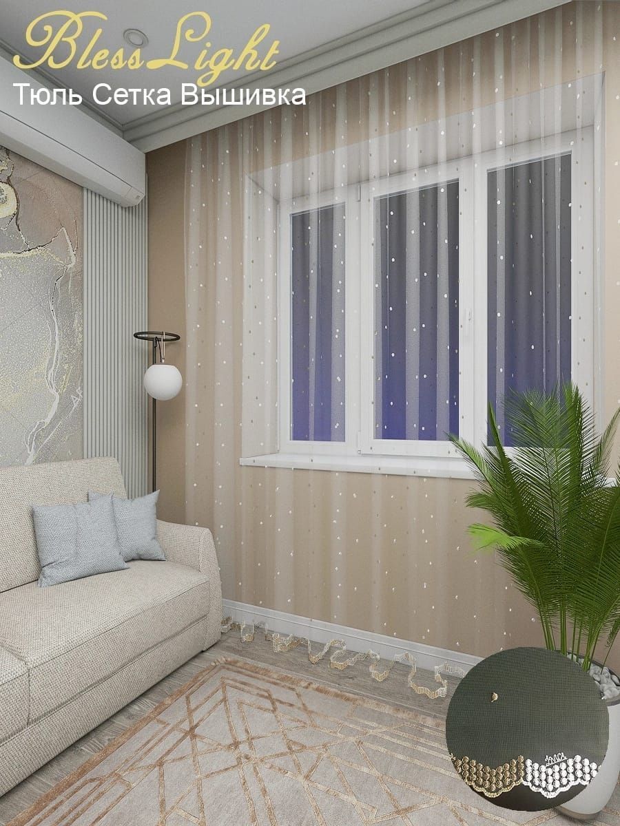 Мягкая, легкая тюль сетка с элегантными складками, идеально вписывается в интерьер, хорошо пропускает свет, устойчива к воздействию прямых солнечных лучей.