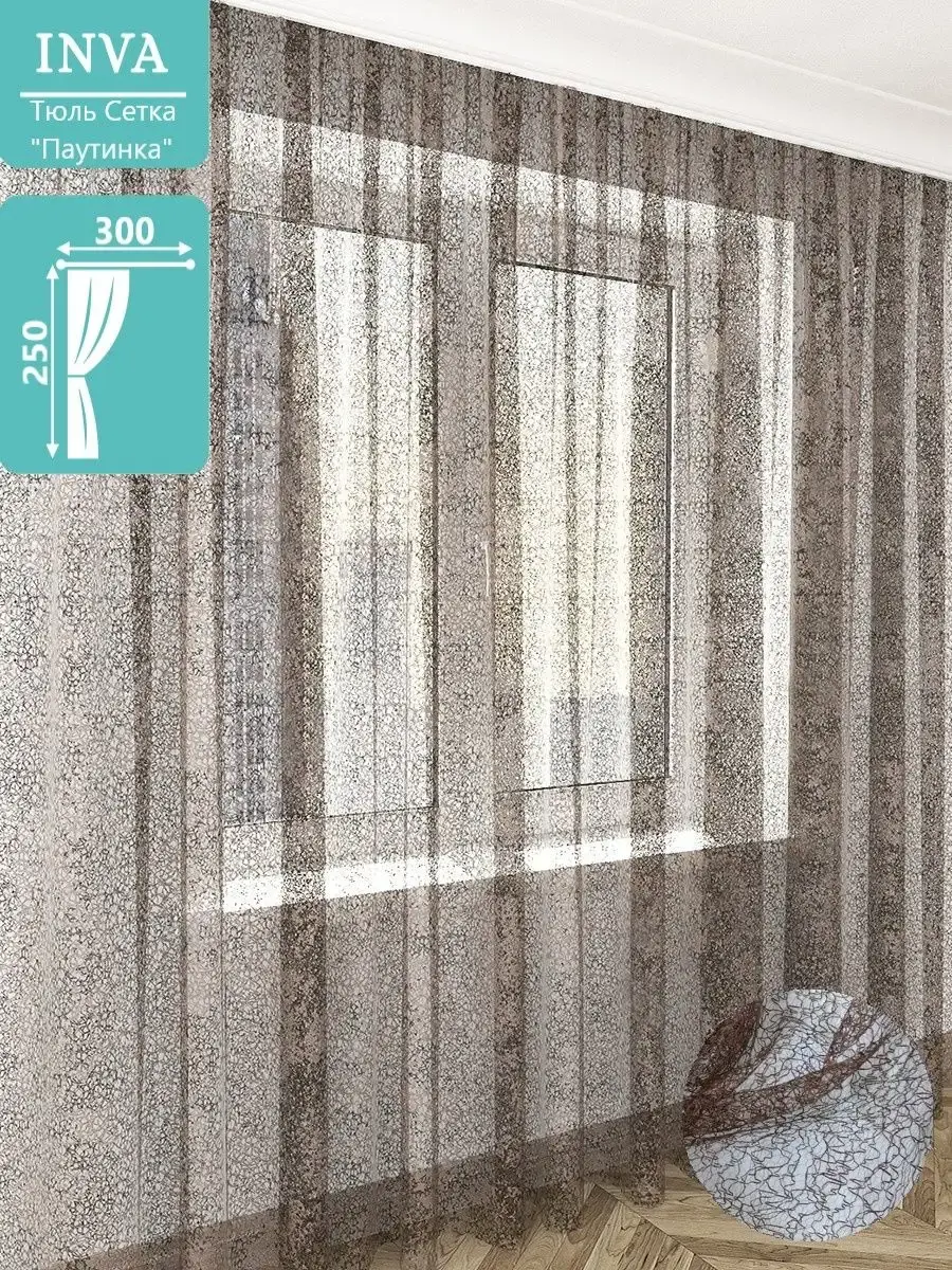 Тюль сетка Паутинка 1 шт полупрозрачная, с нежным узором идеально подойдет для оформления интерьера в любой комнате, высота 250 см ширина 300 см, необыкновенно воздушная, легкая и красивая, будет стильным декором для комнат в вашем доме. Декоративная однотонная тюлевая штора Паутинка 250*300 будет отличным аксессуаром для гостиной, для спальни, для кухни и в детскую комнату или в качестве декора в беседке в саду. Она выполнена из качественного полотна из Турции, ее состав это 100 процентный полиэстер. Придает уют и понравится и взрослым, и детям. В комплекте имеется крепление к карнизу для крючков или штанги. Сетка из синтетической ткани 250 300 сочетается как с портьерами, аксессуарами, с короткими и длинными нитяными, рулонными шторами, гардинами, канвас, лен, мрамор, рогожка, комплект шторы блэкаут blackout. Зановески с сеткой в виде паутинки представлены в разных цветах и подойдут в дом, квартиру, для дачи и на балкон. Тюль занавеска подходит для потолочного карниза шириной до 300 сантиметров а так же для карниза со штангой с диаметром до 20 мм. К шторе пришита шторная прозрачная лента шириной 6см, которая легко стягивается на четыре кордовые нити и создает аккуратные складки в форме "бабочки". Обязательно проверьте нити в шторной ленте, они должны быть надежно завязаны с одного края. Мягкая, легкая туль с элегантными складками, идеально вписывается в интерьер. Вуаль хорошо пропускает свет, устойчива к воздействию прямых солнечных лучей. В составе ткани полиэфирное волокно, что делает изделие практичным и устойчивым к большому количеству стирок. Уход: стирка при 40 градусах, деликатный отжим, отбеливание запрещено.