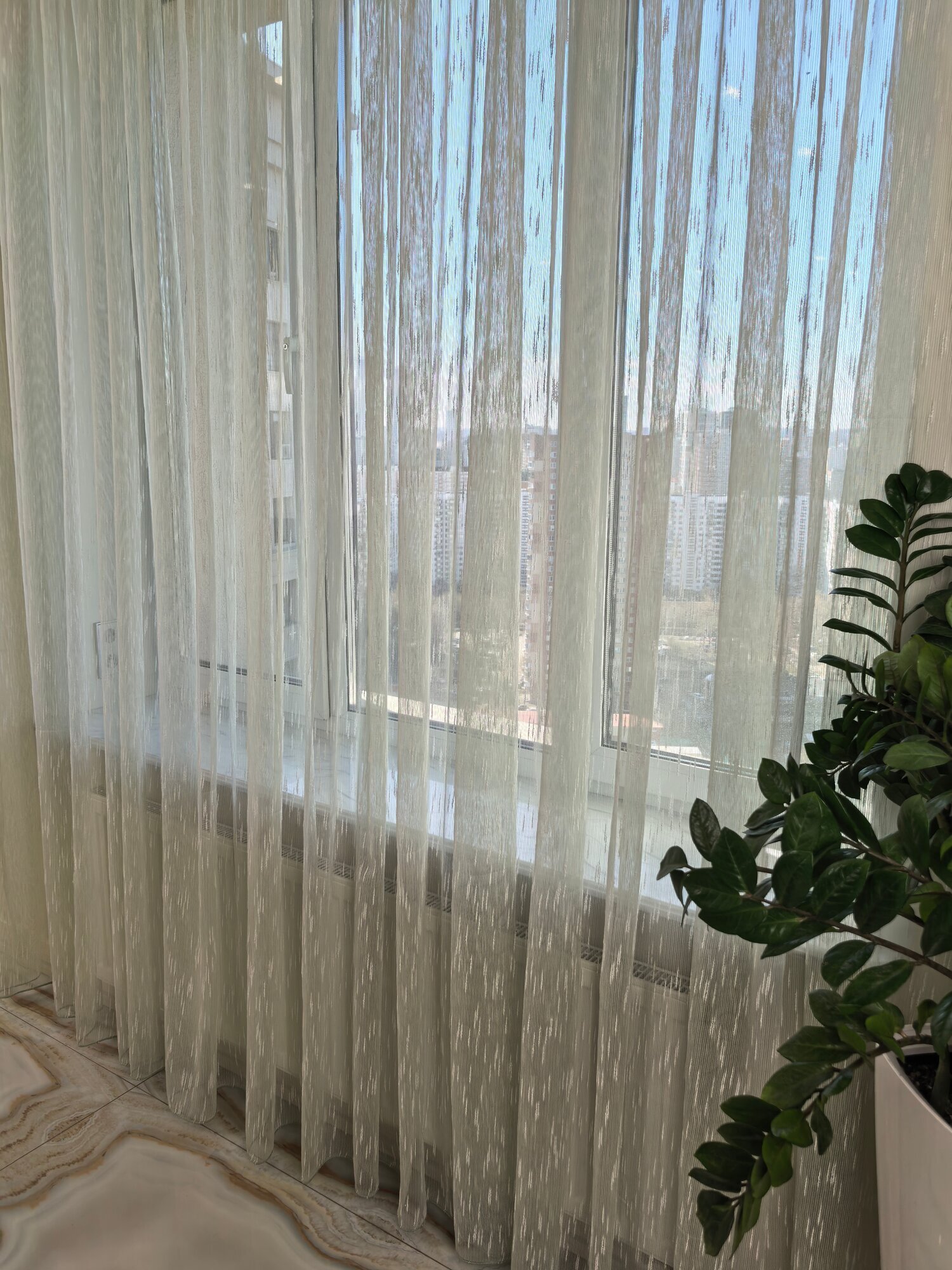 Тюль оснащен шторной лентой шириной 6 см, которая позволяет легко создавать аккуратные складки в форме "бабочки". Рекомендуемая сборка 1:2 обеспечивает идеальное сочетание объема и драпировки.