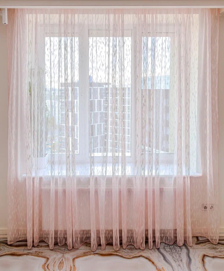 Тюль выполнен из ткани лён, которая отличается своей прочностью и легкостью. Светло-розовый цвет тюля придает ему воздушность и легкость, делая его прекрасным дополнением к любому интерьеру.