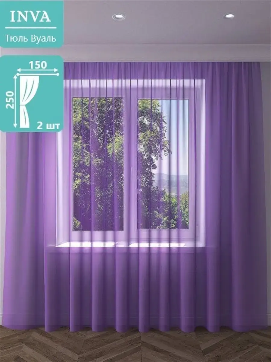 Комплект 2шт из двух полупрозрачный вуалей, высота 250см и ширина 150см, необыкновенно воздушные, легкие и красивые, будут стильным декором для комнат в вашем доме. Фиолетовая тюль будет отличным аксессуаром для гостиной, для спальни, для кухни и в детскую комнату. В комплекте имеется крепление к карнизу для крючков или штанги. Прекрасно смотрятся как с портьерами, аксессуарами, с короткими и длинными нитяными, рулонными шторами, гардинами, канвас, лен, мрамор, рогожка, комплект шторы блэкаут blackout. Зановески представлены в разных цветах и подойдут в дом, квартиру, для дачи и на балкон. Тюль подходит для потолочного карниза шириной до 300 сантиметров, а так же для карниза со штангой с диаметром до 20 мм. К шторе пришита шторная белая лента шириной 6см, которая легко стягивается на четыре кордовые нити и создает аккуратные складки в форме "бабочки". Обязательно проверьте нити в шторной ленте, они должны быть надежно завязаны с одного края. Мягкая, легкая занавеска с элегантными складками, идеально вписывается в интерьер. Вуаль хорошо пропускает свет, устойчива к воздействию прямых солнечных лучей. В составе ткани полиэфирное волокно, что делает изделие практичным и устойчивым к большому количеству стирок. Уход: стирка при 40 градусах, деликатный отжим, отбеливание запрещено.
