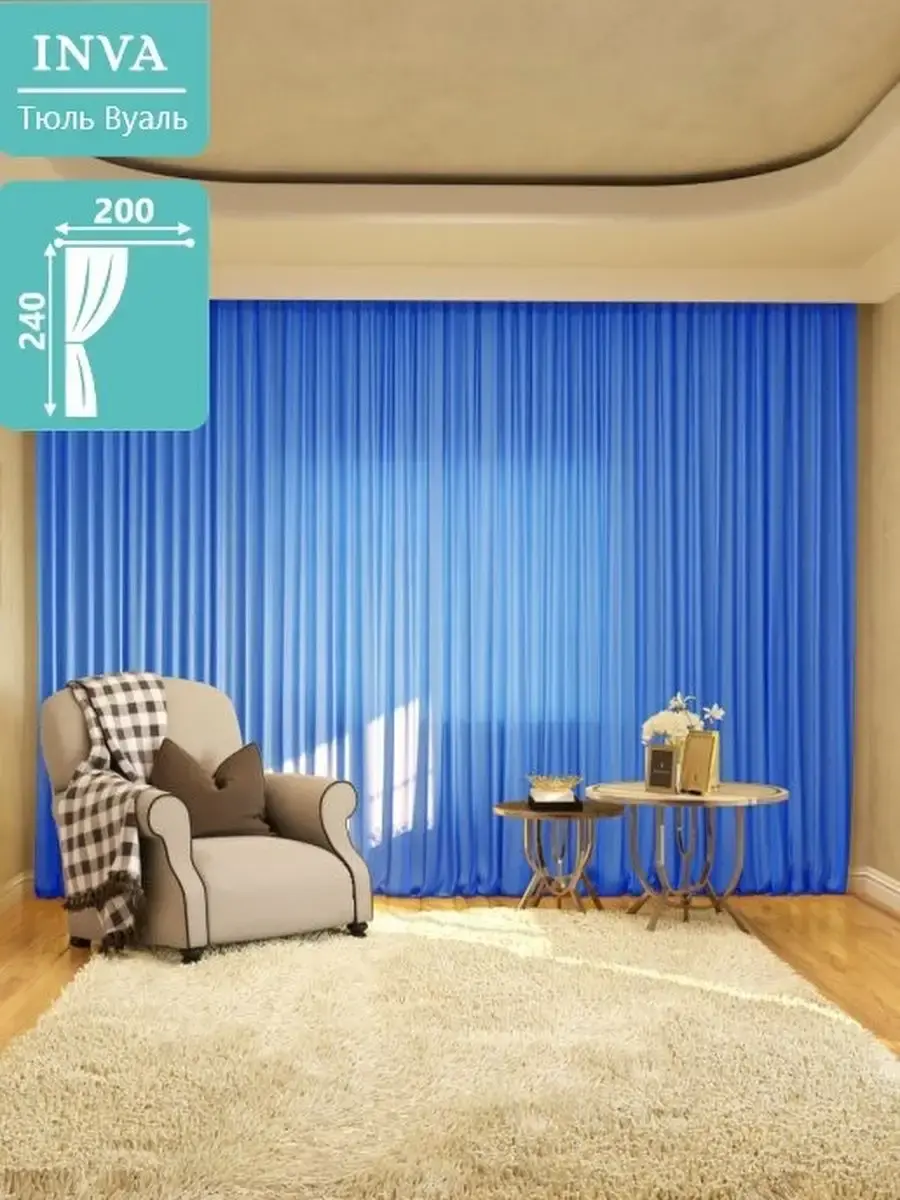 Тюль 1шт из полупрозрачной вуали, высота 240 см ширина 200 см, необыкновенно воздушная, легкая и красивая, будет стильным декором для комнат в вашем доме. Синяя тюль будет отличным аксессуаром для гостиной, для спальни, для кухни и в детскую комнату. В комплекте имеется крепление к карнизу для крючков или штанги. Прекрасно смотрятся как с портьерами, аксессуарами, с короткими и длинными нитяными, рулонными шторами, гардинами, канвас, лен, мрамор, рогожка, комплект шторы блэкаут blackout. Зановески представлены в разных цветах и подойдут в дом, квартиру, для дачи и на балкон. Тюль подходит для потолочного карниза шириной до 300 сантиметров а так же для карниза со штангой с диаметром до 20 мм. К шторе пришита шторная белая лента шириной 6см, которая легко стягивается на четыре кордовые нити и создает аккуратные складки в форме "бабочки". Обязательно проверьте нити в шторной ленте, они должны быть надежно завязаны с одного края. Мягкая, легкая занавеска с элегантными складками, идеально вписывается в интерьер. Вуаль хорошо пропускает свет, устойчива к воздействию прямых солнечных лучей. В составе ткани полиэфирное волокно, что делает изделие практичным и устойчивым к большому количеству стирок. Уход: стирка при 40 градусах, деликатный отжим, отбеливание запрещено.