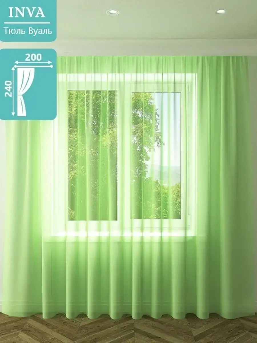 Тюль 1шт из полупрозрачной вуали, высота 240 см ширина 200 см, необыкновенно воздушная, легкая и красивая, будет стильным декором для комнат в вашем доме. Светло-зеленая тюль будет отличным аксессуаром для гостиной, для спальни, для кухни и в детскую комнату. В комплекте имеется крепление к карнизу для крючков или штанги. Прекрасно смотрятся как с портьерами, аксессуарами, с короткими и длинными нитяными, рулонными шторами, гардинами, канвас, лен, мрамор, рогожка, комплект шторы блэкаут blackout. Зановески представлены в разных цветах и подойдут в дом, квартиру, для дачи и на балкон. Тюль подходит для потолочного карниза шириной до 300 сантиметров а так же для карниза со штангой с диаметром до 20 мм. К шторе пришита шторная белая лента шириной 6см, которая легко стягивается на четыре кордовые нити и создает аккуратные складки в форме "бабочки". Обязательно проверьте нити в шторной ленте, они должны быть надежно завязаны с одного края. Мягкая, легкая занавеска с элегантными складками, идеально вписывается в интерьер. Вуаль хорошо пропускает свет, устойчива к воздействию прямых солнечных лучей. В составе ткани полиэфирное волокно, что делает изделие практичным и устойчивым к большому количеству стирок. Уход: стирка при 40 градусах, деликатный отжим, отбеливание запрещено.