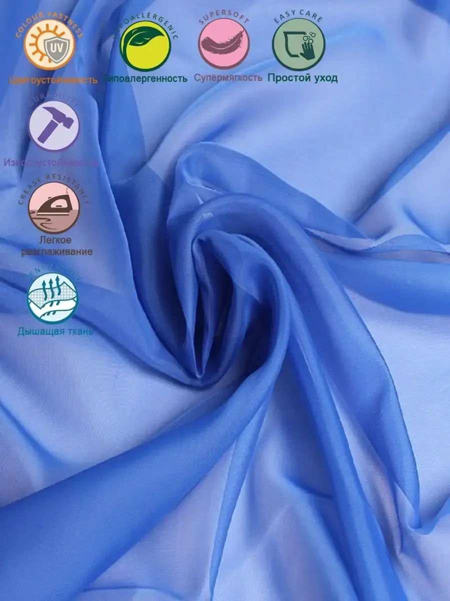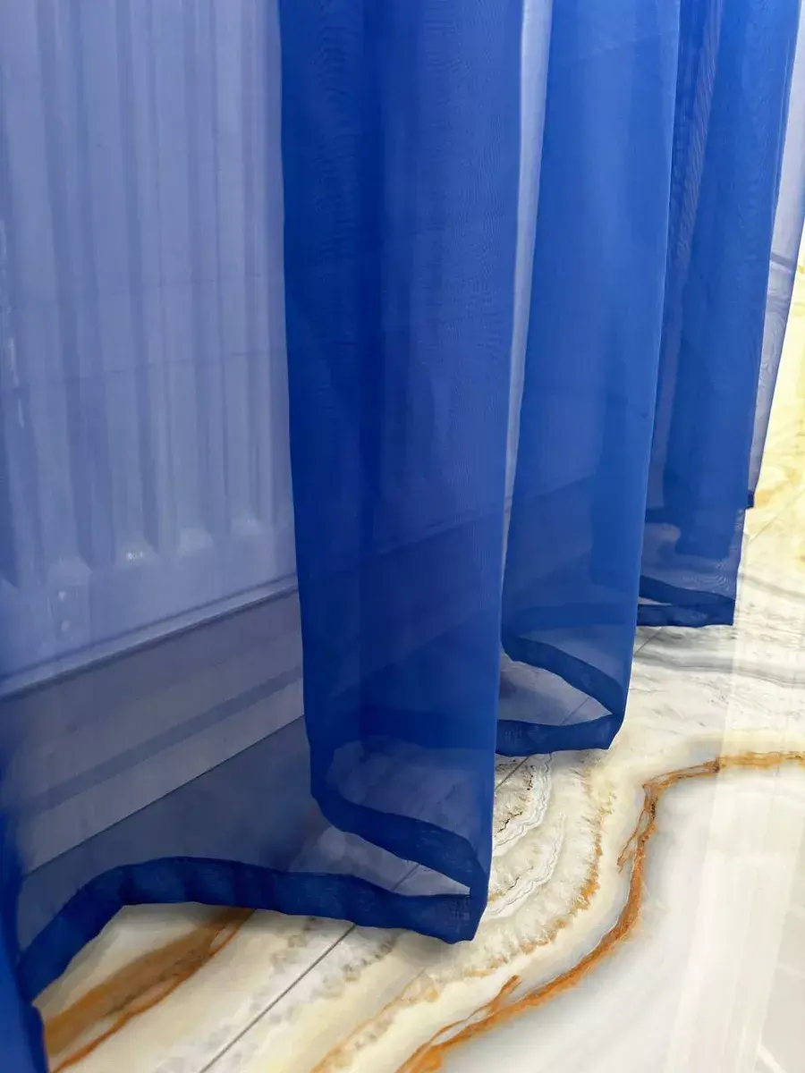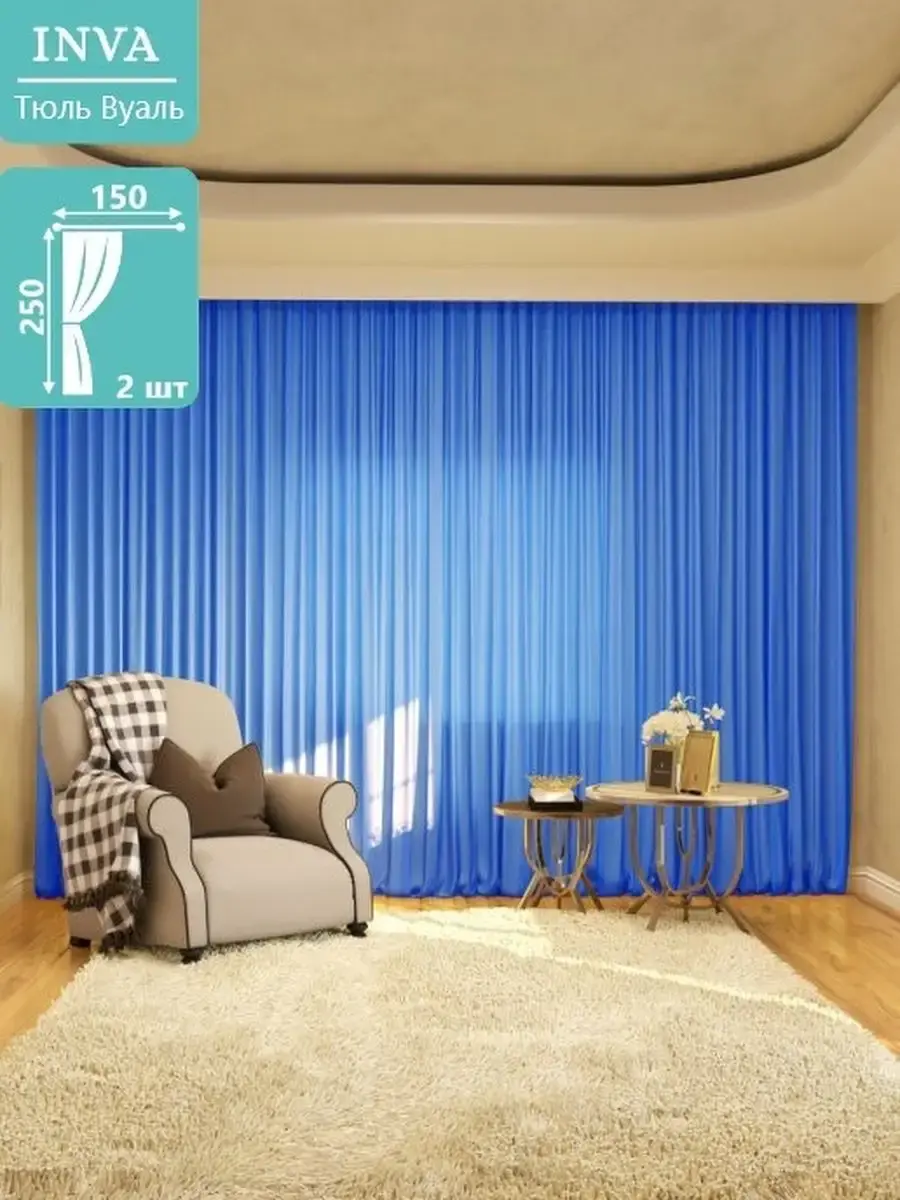 Комплект 2шт из двух полупрозрачный вуалей, высота 240см и ширина 150см, необыкновенно воздушные, легкие и красивые, будут стильным декором для комнат в вашем доме. Синяя тюль будет отличным аксессуаром для гостиной, для спальни, для кухни и в детскую комнату. В комплекте имеется крепление к карнизу для крючков или штанги. Прекрасно смотрятся как с портьерами, аксессуарами, с короткими и длинными нитяными, рулонными шторами, гардинами, канвас, лен, мрамор, рогожка, комплект шторы блэкаут blackout. Зановески представлены в разных цветах и подойдут в дом, квартиру, для дачи и на балкон. Тюль подходит для потолочного карниза шириной до 300 сантиметров, а так же для карниза со штангой с диаметром до 20 мм. К шторе пришита шторная белая лента шириной 6см, которая легко стягивается на четыре кордовые нити и создает аккуратные складки в форме "бабочки". Обязательно проверьте нити в шторной ленте, они должны быть надежно завязаны с одного края. Мягкая, легкая занавеска с элегантными складками, идеально вписывается в интерьер. Вуаль хорошо пропускает свет, устойчива к воздействию прямых солнечных лучей. В составе ткани полиэфирное волокно, что делает изделие практичным и устойчивым к большому количеству стирок. Уход: стирка при 40 градусах, деликатный отжим, отбеливание запрещено.