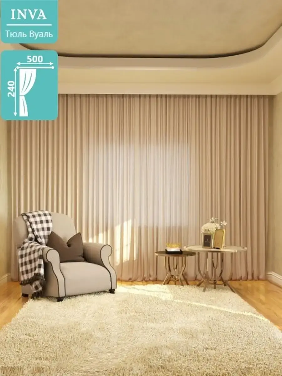 Готовая тюль штора вуаль 1 шт. Идеально подойдет для оформления интерьера в любой комнате, высота 240 см ширина 500 см. Воздушная, легкая и красивая, будет стильным декором для комнат в вашем доме. Длинная декоративная тюлевая штора на шторной ленте 2,4 м х 5 м будет отличным аксессуаром для гостиной, для спальни, для кухни и в детскую комнату или в качестве декора в беседке в саду. Придает уют и понравится и взрослым и детям. Имеет 3 варианта крепления: на крючки с помощью шторной ленты, на кольца или на штангу диаметром до 20 мм. Интерьерная тюль вуаль 240х500 сочетается с портьерами, с короткими и длинными нитяными, рулонными шторами. С гардинами канвас, лен, мрамор, рогожка. Со шторами блэкаут blackout. Тонкий тюль-вуаль украсит оконный проем в любой комнате: в столовой, кабинете и детской, на кухне как кухонный вариант. Вы можете повесить тюль на гардину на балконе, лоджии, веранде или в качестве декора в беседке в саду. Зановеска вуаль подойдет в дом, квартиру, для дачи и на балкон. Тюль занавеска подходит для потолочного карниза шириной до 300 сантиметров а так же для карниза со штангой с диаметром до 20 мм. К шторе пришита шторная лента шириной 6см, которая легко стягивается на четыре кордовые нити и создает аккуратные складки в форме "бабочки". Обязательно проверьте нити в шторной ленте, они должны быть надежно завязаны с одного края. Мягкая, легкая туль с элегантными складками, идеально вписывается в интерьер. Вуаль хорошо пропускает свет, устойчива к воздействию прямых солнечных лучей. В составе ткани полиэфирное волокно, что делает изделие практичным и устойчивым к большому количеству стирок. Уход: стирка при 30 градусах, деликатный отжим, отбеливание запрещено.