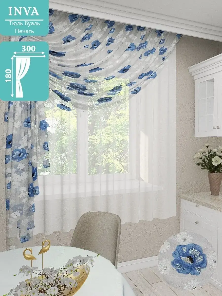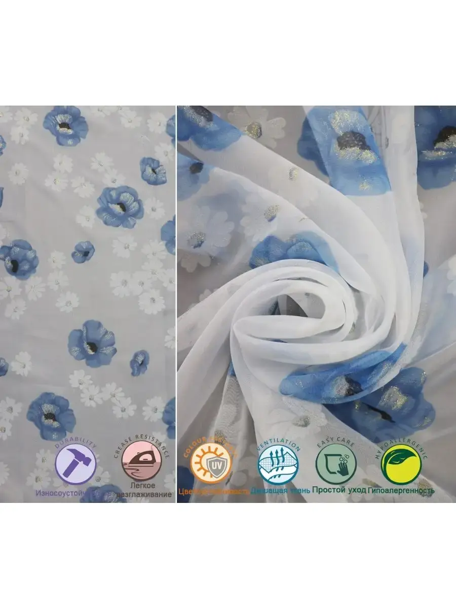 Готовый комплект тюля 1шт из двух полотен вуали, закрепленных на одной шторной ленте. Верхнее полотно с печатным рисунком ''Маки'' стягивается на левую сторону. Ширина тюля без сборки 300см, в собранном виде 150см, высота 180см. Верхнее полотно из белой вуали с синими маками собирается по диагонали на тесьму, пришитую с обратной стороны. Нижнее полотно из белой матовой вуали не пропускает прямые солнечные лучи и создает уютную атмосферу. Необыкновенно воздушная, легкая и красивая, будет стильным декором для комнат в вашем доме. Тюль будет отличным аксессуаром для гостиной, для спальни, для кухни и в детскую комнату. В комплекте имеется крепление к карнизу для крючков или штанги. Прекрасно смотрятся как с портьерами, аксессуарами, с короткими и длинными нитяными, рулонными шторами, гардинами, канвас, лен, мрамор, рогожка, комплект шторы блэкаут blackout. Зановески представлены в разных цветах и подойдут в дом, квартиру, для дачи и на балкон. Тюль подходит для потолочного карниза шириной до 300 сантиметров, а так же для карниза со штангой с диаметром до 20 мм. К шторе пришита шторная белая лента шириной 6см, которая легко стягивается на четыре кордовые нити и создает аккуратные складки в форме "бабочки". Обязательно проверьте нити в шторной ленте, они должны быть надежно завязаны с одного края. Мягкая, легкая занавеска с элегантными складками, идеально вписывается в интерьер. Вуаль хорошо пропускает свет, устойчива к воздействию прямых солнечных лучей. В составе ткани полиэфирное волокно, что делает изделие практичным и устойчивым к большому количеству стирок. Уход: стирка при 40 градусах, деликатный отжим, отбеливание запрещено.